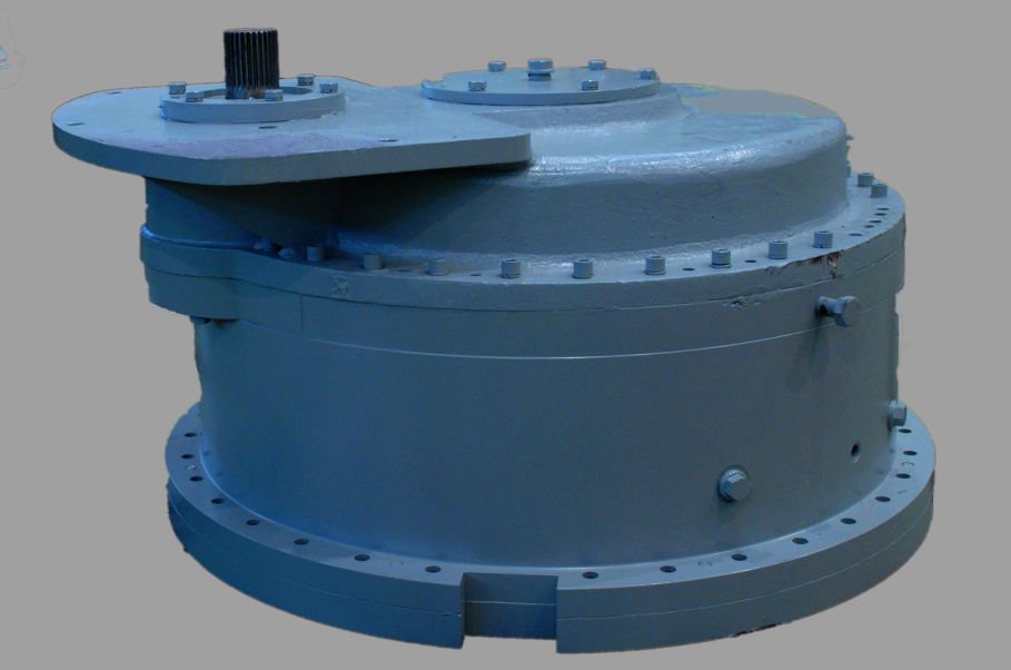 行走减速机安装在履带架上,由电机牵引驱动挖掘机的走行;回转减速机安装在回转平台上,为行星结构一级减速机,电机驱动减速机,减速机输出轴通过联接回转立轴齿轮与回转大齿圈啮合,实现挖掘机的回转运动;提升减速机为挖掘机提升机构的主传动设备,用于驱动提升卷筒;推压减速机位于起重臂上,减速机输出轴联接小齿轮与斗杆齿条啮合,驱动齿条左往复运动,与提升机构一起工作实现铲斗挖掘作业。