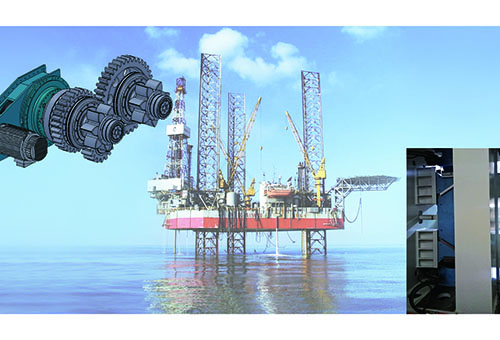 升降系统采用齿轮齿条啮合原理实现平台或桩腿的升降操作。安装在船体的固桩架上,可以采用电机和液压马达驱动,每一升降单元有爬升齿轮、减速机、电机/液压马达和具有自动保护功能的电磁刹车组成。配有电机控制中心、中央控制台和桩边控制柜;锁紧系统由液压驱动,由螺杆升降装置,锁紧齿块,楔块,油缸和分配器,泵站,桩边控制柜等组成。