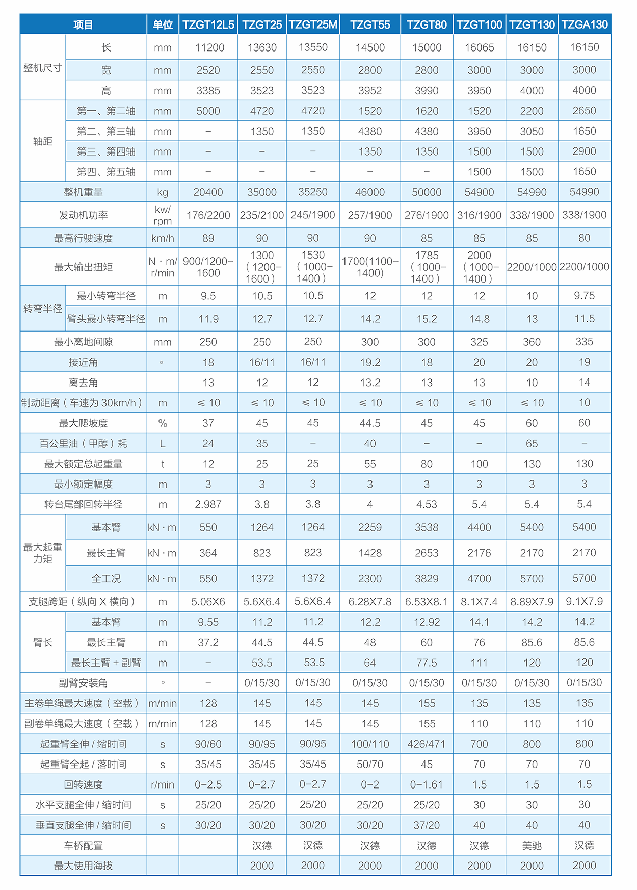 TZGT系列汽车起重机和TZGA系列全地面起重机,产品涵盖12-130t,整机性能行业领先
