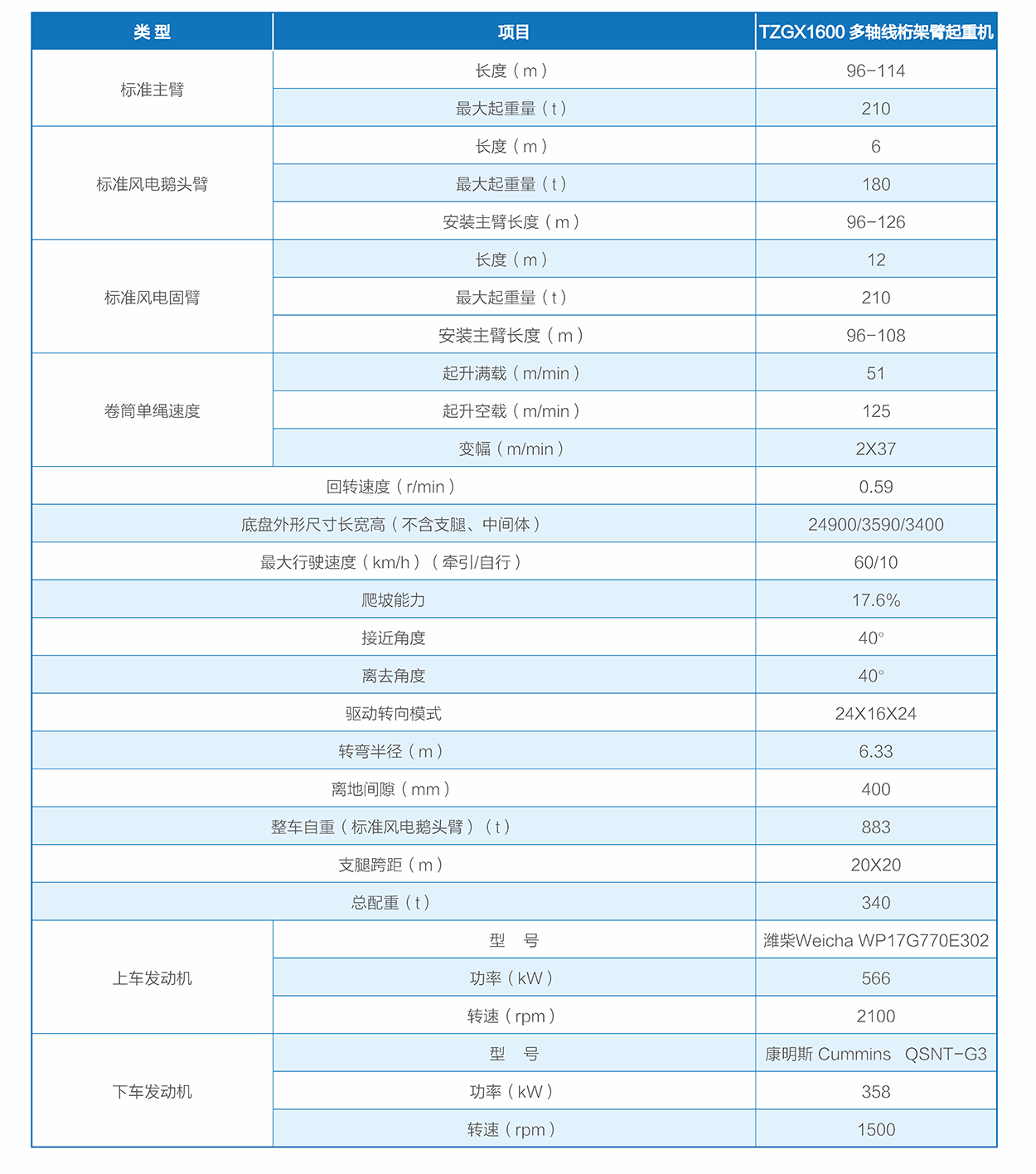 TZGX1600多轴线桁架臂起重机针对风机安装特点,上车采用快拆式桁架臂起重机结构,下车采用可自行、可牵引多轴线底盘,整机最大部件运输宽度小于3.5m,起重能力超强,转场高效便捷,可满足百米级4.XMW及以上风机吊装。