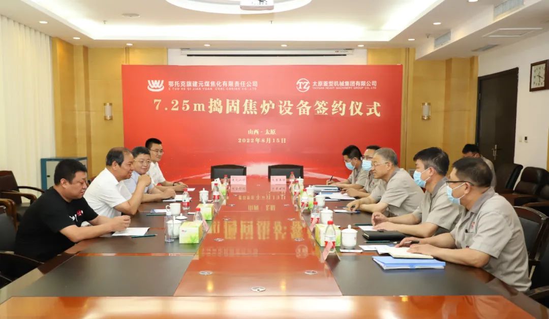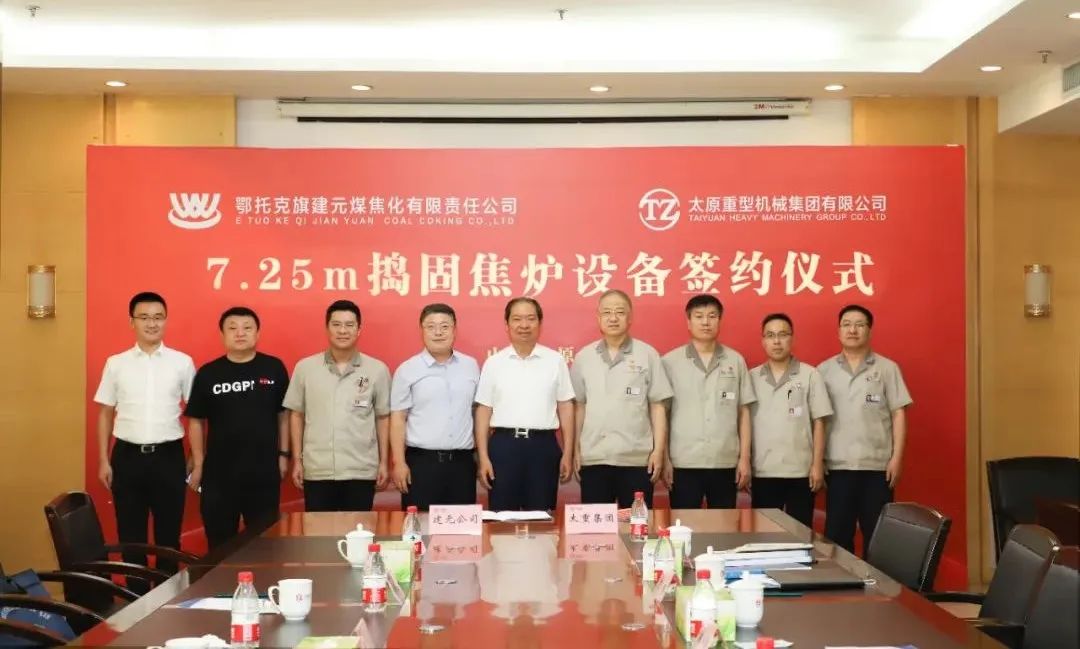 为该公司提供的第7套分体捣固焦炉设备。集团公司党委书记、董事长韩珍堂与鄂托克旗建元煤焦化有限责任公司董事长樊三维分别代表双方进行签约。