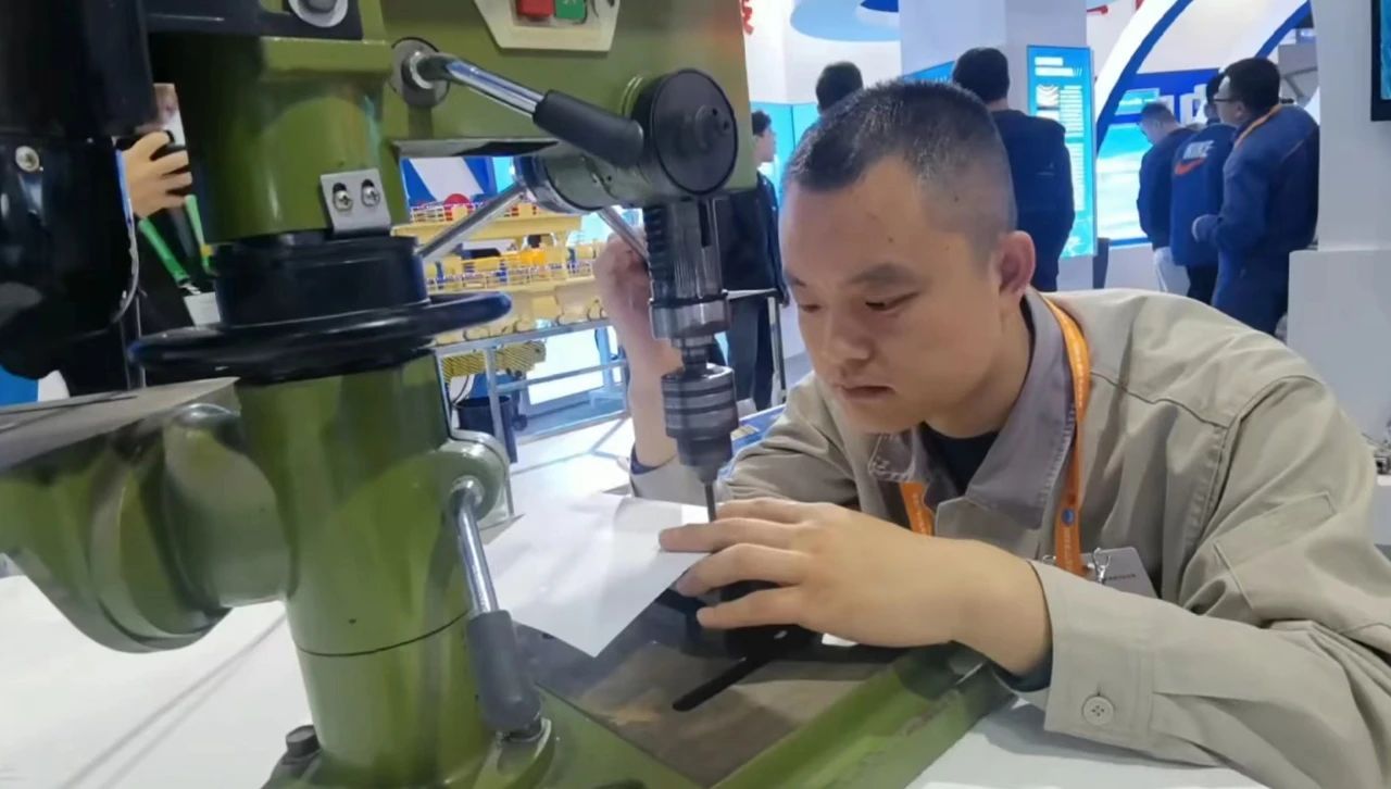 人的精神面貌和工匠风采。齿传分公司职工单璐还现场展示了技艺绝活,引得参观者驻足围观。大家屏息凝神、目光专注,只见操作者在手机上放置了一张厚度仅有0.1毫米的A4纸,通过手动操作台钻在纸张上精准地打出了圆孔,但手机屏幕完好无损,出神入化的技艺赢得了现场观众的阵阵掌声。