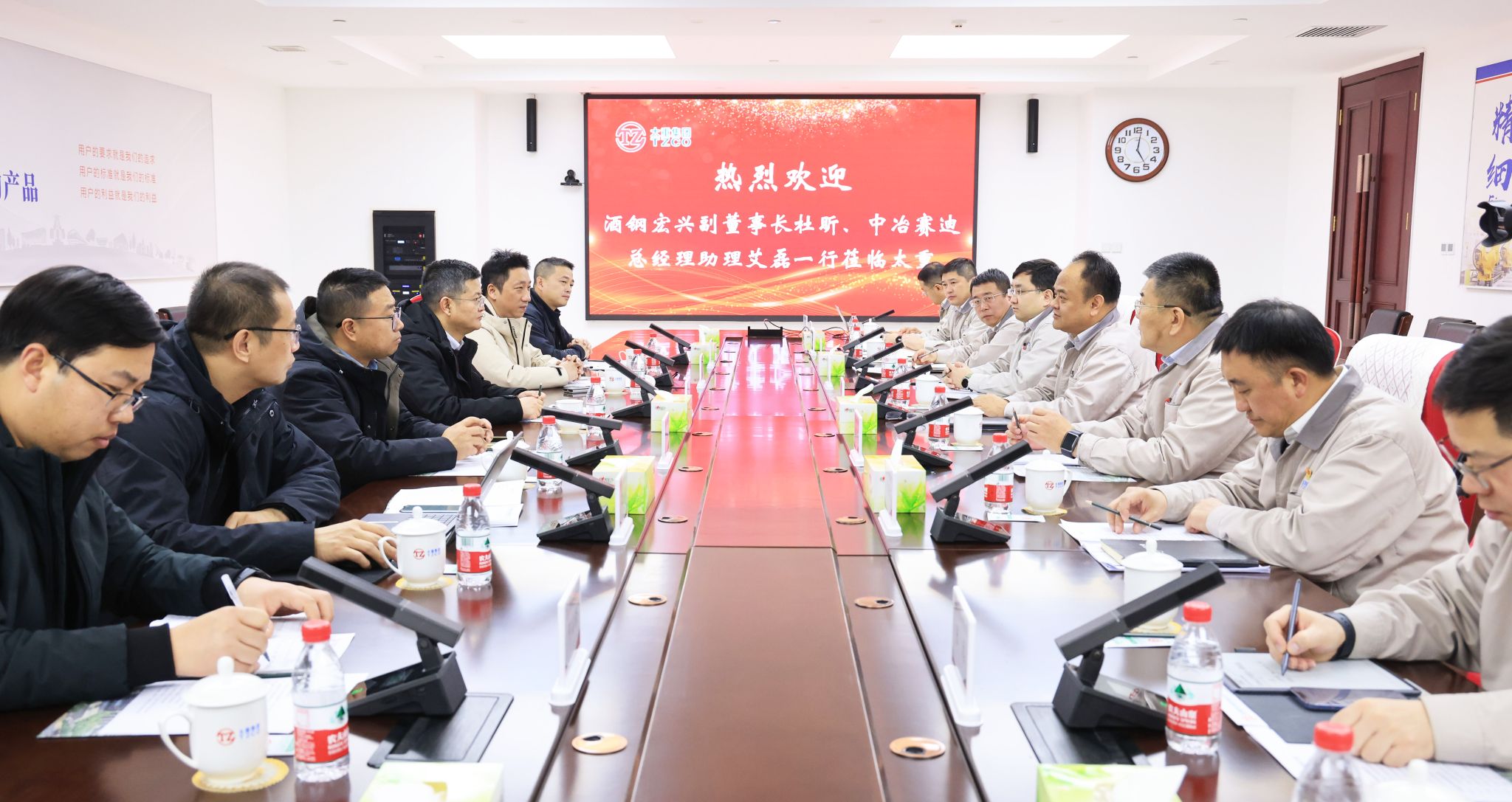 1月28日,甘肃酒钢集团宏兴钢铁股份有限公司副董事长杜昕、中冶赛迪集团有限公司总经理助理艾磊一行来集团公司友好访问。集团公司党委副书记、副董事长、总经理陶家晋热情接待了客人一行,就推动项目合作、携手共谋发展等事宜进行深入交流。