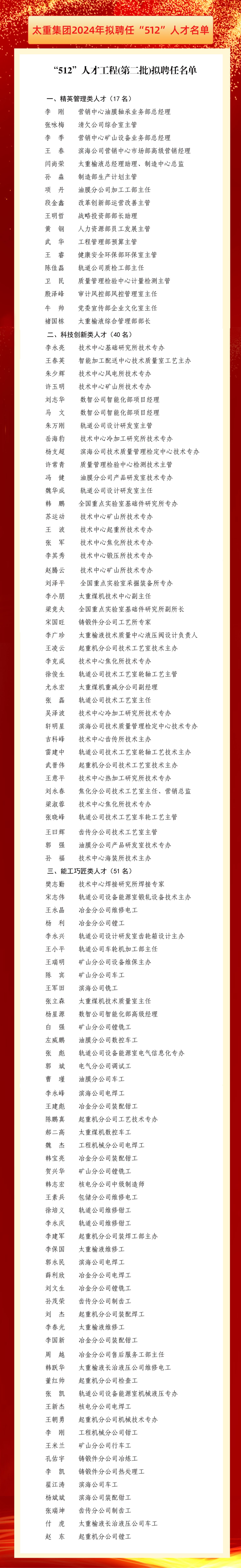 近日,公司“512”人才工程(第二批)聘任名单重磅出炉!此次聘任108人,其中包括17名精英管理人才、40名科技创新人才、51名能工巧匠人才,均为公司各岗位政治上靠得住、品行上能服众、关键时起作用的“先锋干将”。