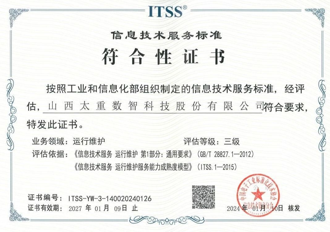 数智公司于2023年5月开始启动ITSS能力成熟度三级认定准备工作。在基于已拥有信息技术服务管理体系(ISO 20000)认证的基础上,成立了ITSS领导组及工作组,开展了对ITSS标准的学习以及差异性分析,结合ITSS制定并完善了相关服务管理体系和制度,完成了数智公司的ITSS体系建设。
