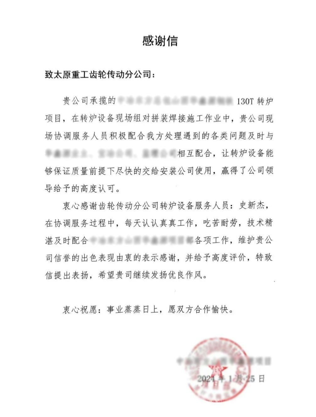 近日,公司收到用户寄来的感谢信,信中对齿传分公司在用户转炉项目中全力配合、保质保量完成交货任务表示衷心感谢,对公司雄厚的技术和专业的服务给予充分赞赏。