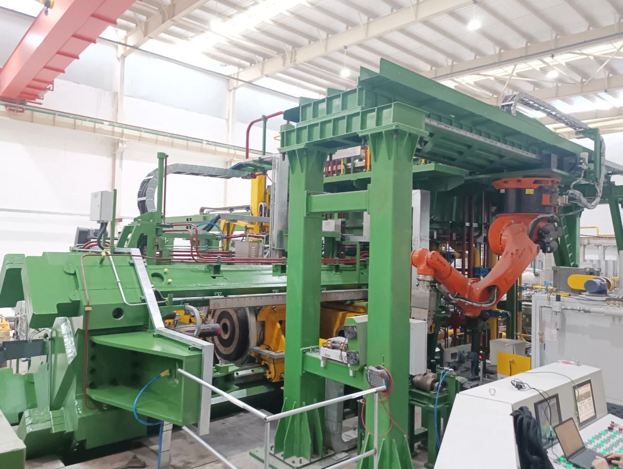 自主研发的28MN反向铜挤压机是用于挤压生产铜合金线材产品的设备,集自动化、智能化、高端化于一体,在节能环保、平稳运行、安全性能等方面处于行业领先水平。此台挤压机,在技术上进行了升级迭代,将设备辅助机构中的液压驱动部分,升级为伺服控制或电气驱动装置,大幅降低了辅助机构中液压系统所占比例,既能缩短非挤压时间、提高生产效率,也能保证设备的高控制精度、低故障率。同时,模具循环系统特别采用模具循环机器人,实现了模具加热、打磨、拆模、装模自动化循环。 与普通挤压机相比,反向铜挤压机辅助机构数量更多,工艺流程更为复杂,调试任务也更加繁重。考虑到用户的生产节奏,项目进入调试阶段后,公司技术中心锻压所技术人员和锻压设备分厂现场安调人员相互配合,加快调试进度,晚上测试设备运行情况、发现问题,白天调试设备、解决问题,团队齐心协力抢工期,克服种种困难将调试周期提前了7天,顺利完成设备热负荷试车。 锚定新质生产力,释放发展新动能。该项目的顺利试车是制造业与智能化的又一次深度融合,是“永利赌场