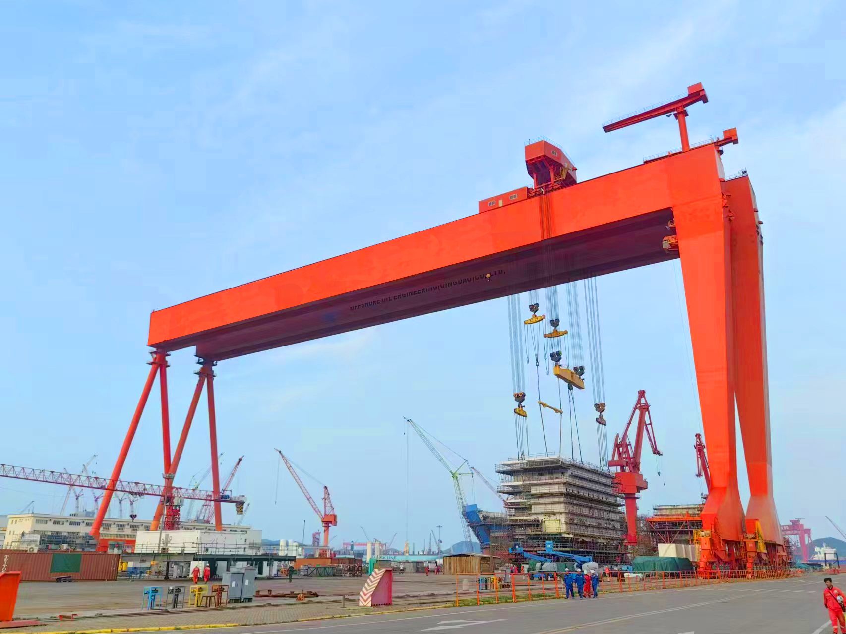 的拳头产品,是桥式起重机的一种变形型式,不仅继承了桥式起重机的固有优势,还具有场地利用率高、作业范围大、适应面广、通用性强等特点。投入运行后,能够为业主船坞内在建项目提供更大的起吊能力,在项目建造、码头船舶的装卸作业中担大任、挑大梁。此次签单的两台设备中,其中一台的起重量高达1200吨,起升高度不低于76米,跨距162米,作业区域可以覆盖用户整个总装场地,综合性能达到国际先进水平,设备投用后,能大幅度提高用户总装分段工作效率,提升用户市场竞争力。另一台则用于千吨级模块的总装、搭载及其大型设备的吊装作业。