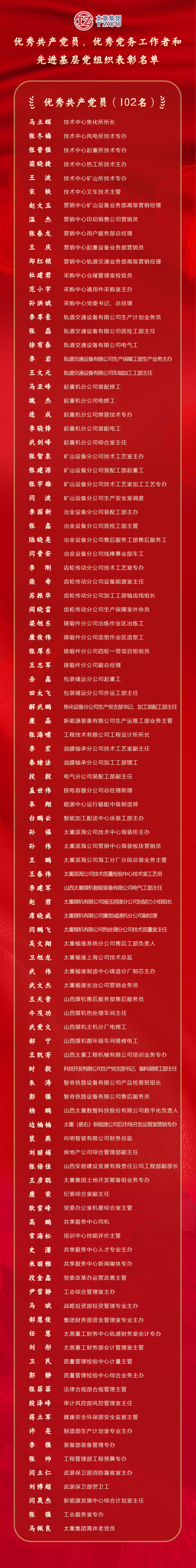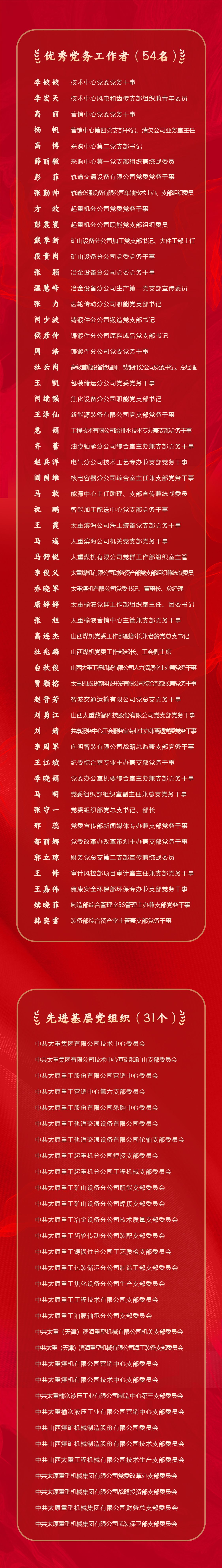 授予宋轶、郑红锁等102名同志“优秀共产党员”称号,授予张勤帅、高博、李宏天等54名同志“优秀党务工作者”称号,授予中共太原重工油膜轴承分公司支部委员会、中共永利赌场-澳门永利皇宫赌场