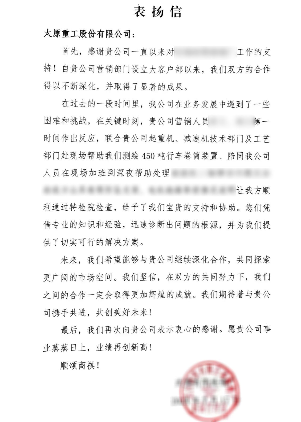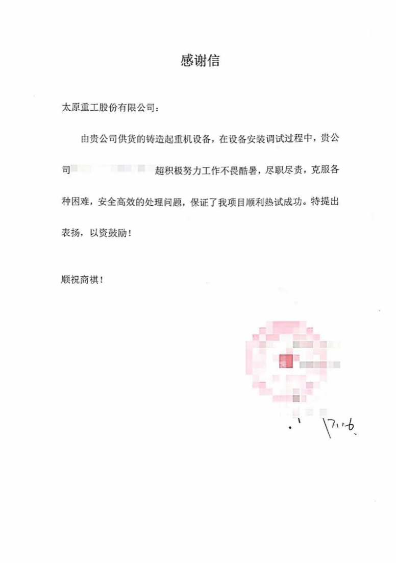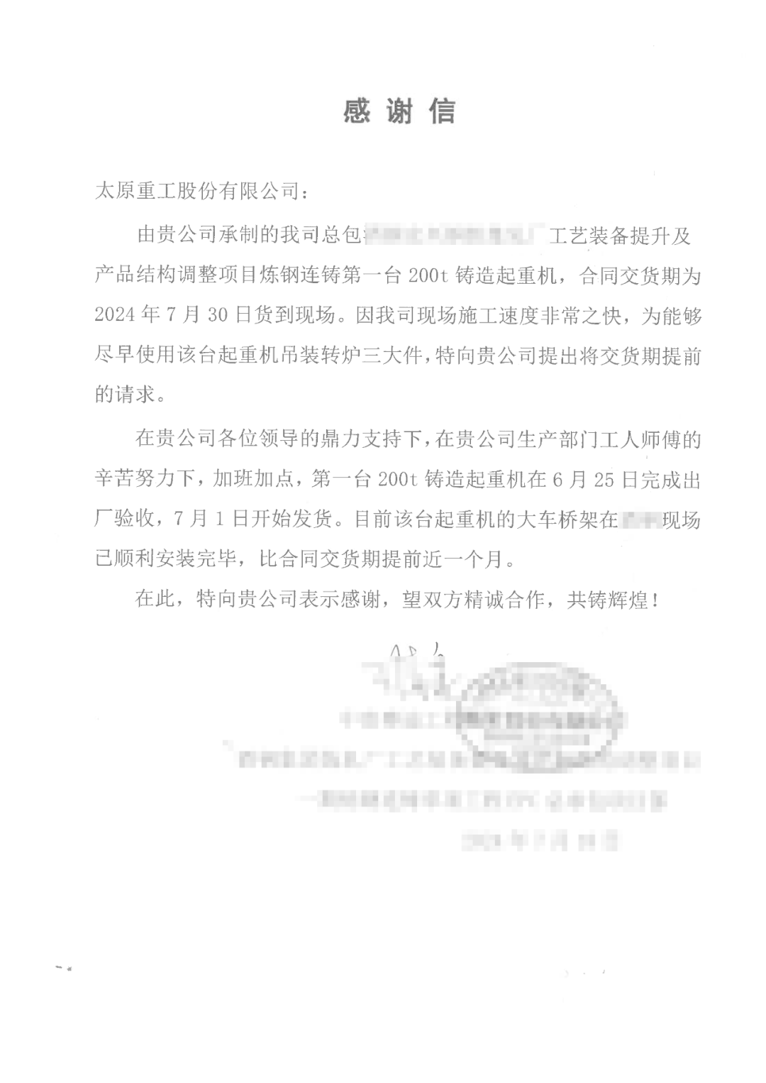 提出提前交付一台200吨铸造起重机的请求。时间紧、任务重、质量要求高,面对“用户之所急”,公司积极响应,及时协调技术和生产部门,最终比合同交货期提前近一个月交付设备,确保了用户工程项目顺利投产。“望双方精诚合作,共铸辉煌!”无疑是对永利赌场