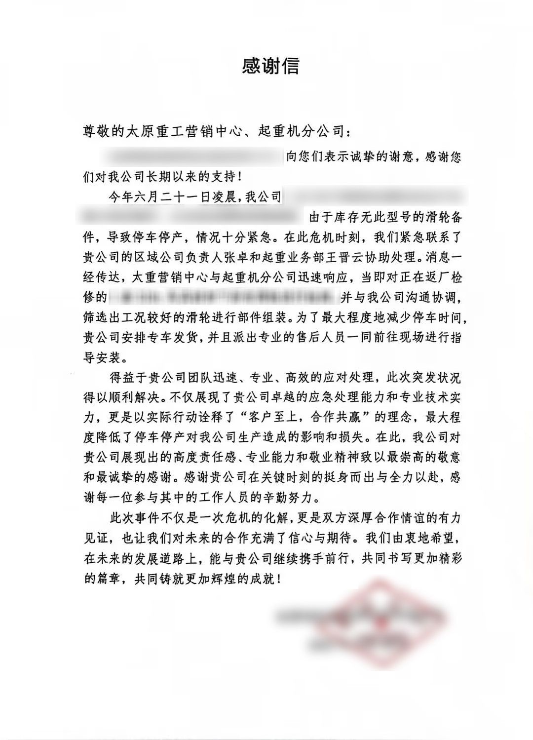 面对用户生产现场的突发状况,公司迅速响应。为了尽可能降低损失、保障用户尽快复产,公司售后服务工程师连夜筛选出工况达标的滑轮进行部件组装,然后又马不停蹄奔赴现场指导安装,以最快的速度解决用户设备故障。“得益于贵公司团队迅速、专业、高效的应对处理,此次突发状况得以顺利解决。”用户对永利赌场