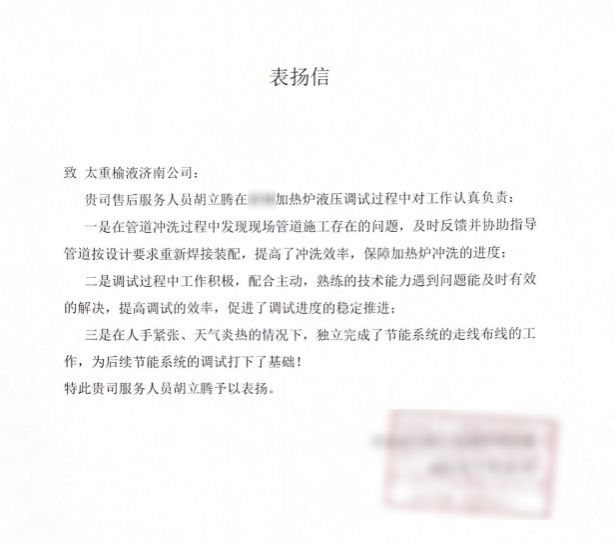一封表扬信,对公司售后服务人员专业的技术、敬业的精神予以高度赞扬。为用户交付设备后,安装调试工作时间紧、任务重,公司立即派出经验丰富的售后专员奔赴用户现场,扎根作业一线、克服高温酷暑,帮助用户完成节能系统安装以及电控的布线走线工作,与此同时,还对用户的管路冲洗方案进行优化,为用户提供切实可行的解决方案,提出专业建议,最大程度保障了用户利益。