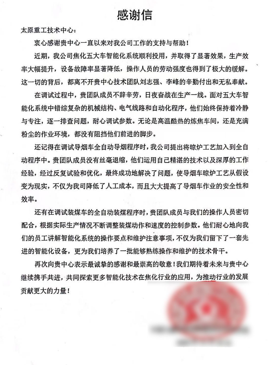 “衷心感谢贵中心一直以来对我公司工作的支持与帮助”,近日,公司以卓越的焦炉智能化成套设备赢得了用户的感谢。这封信不仅是对永利赌场