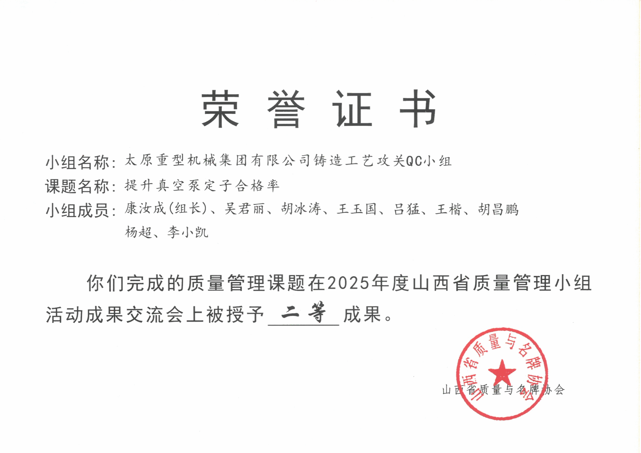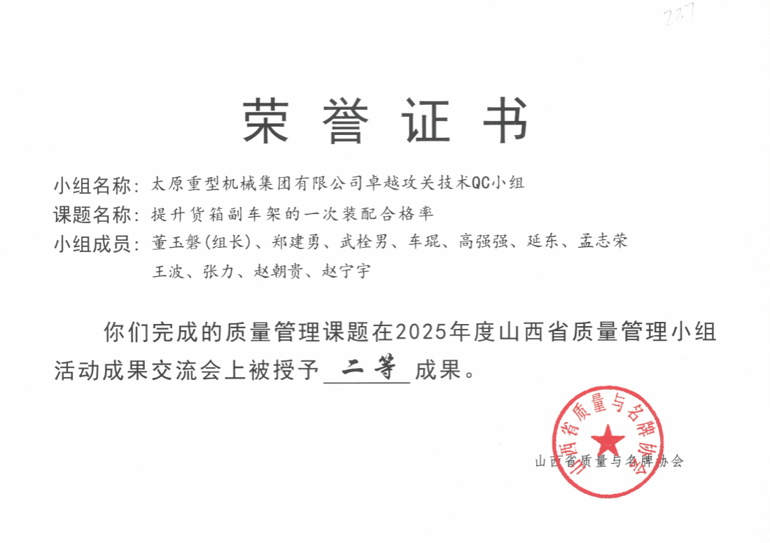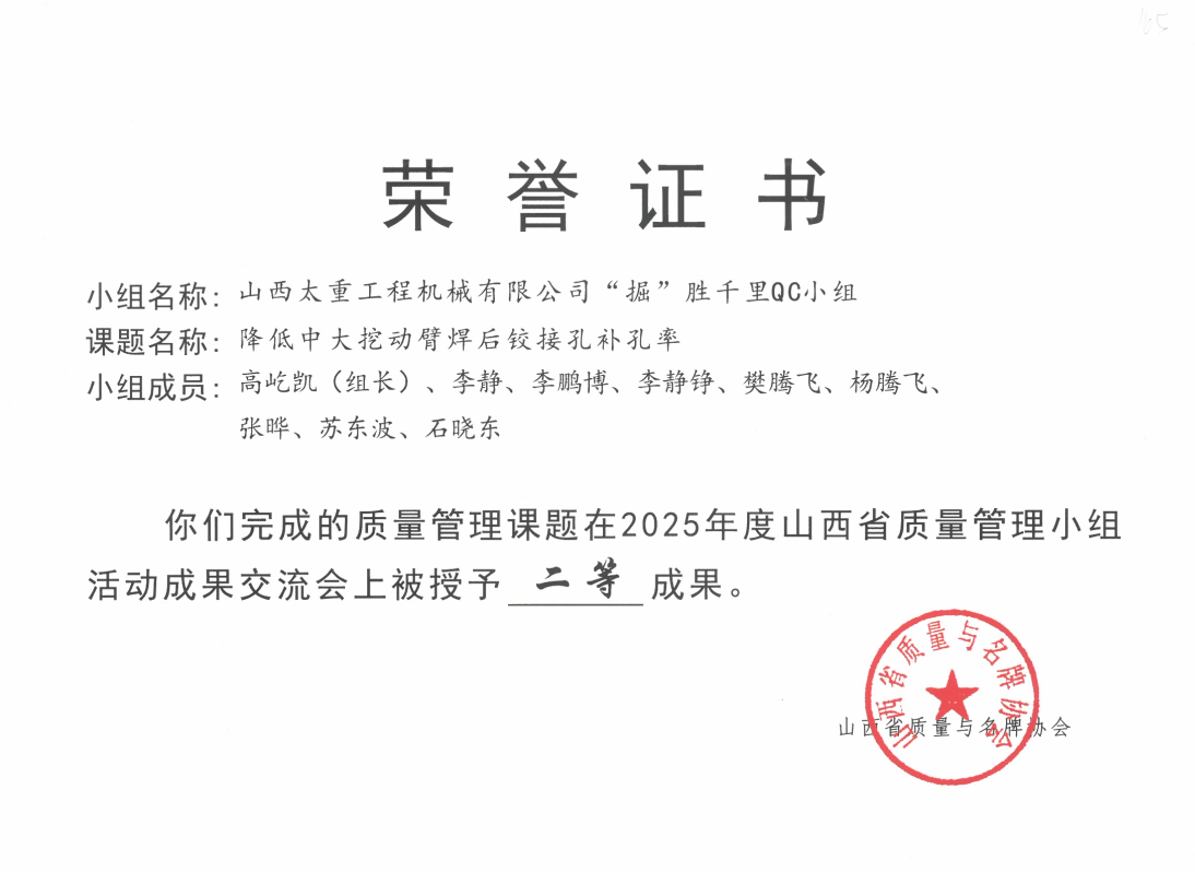 榆液《提升真空泵定子合格率》、工程机械公司《降低中大挖动臂焊后铰接孔补孔率》、油膜分公司《衬套加工效率提升的装置研制》、焦化公司《提升货箱副车架的一次装配合格率》四个项目荣获全省二等成果。