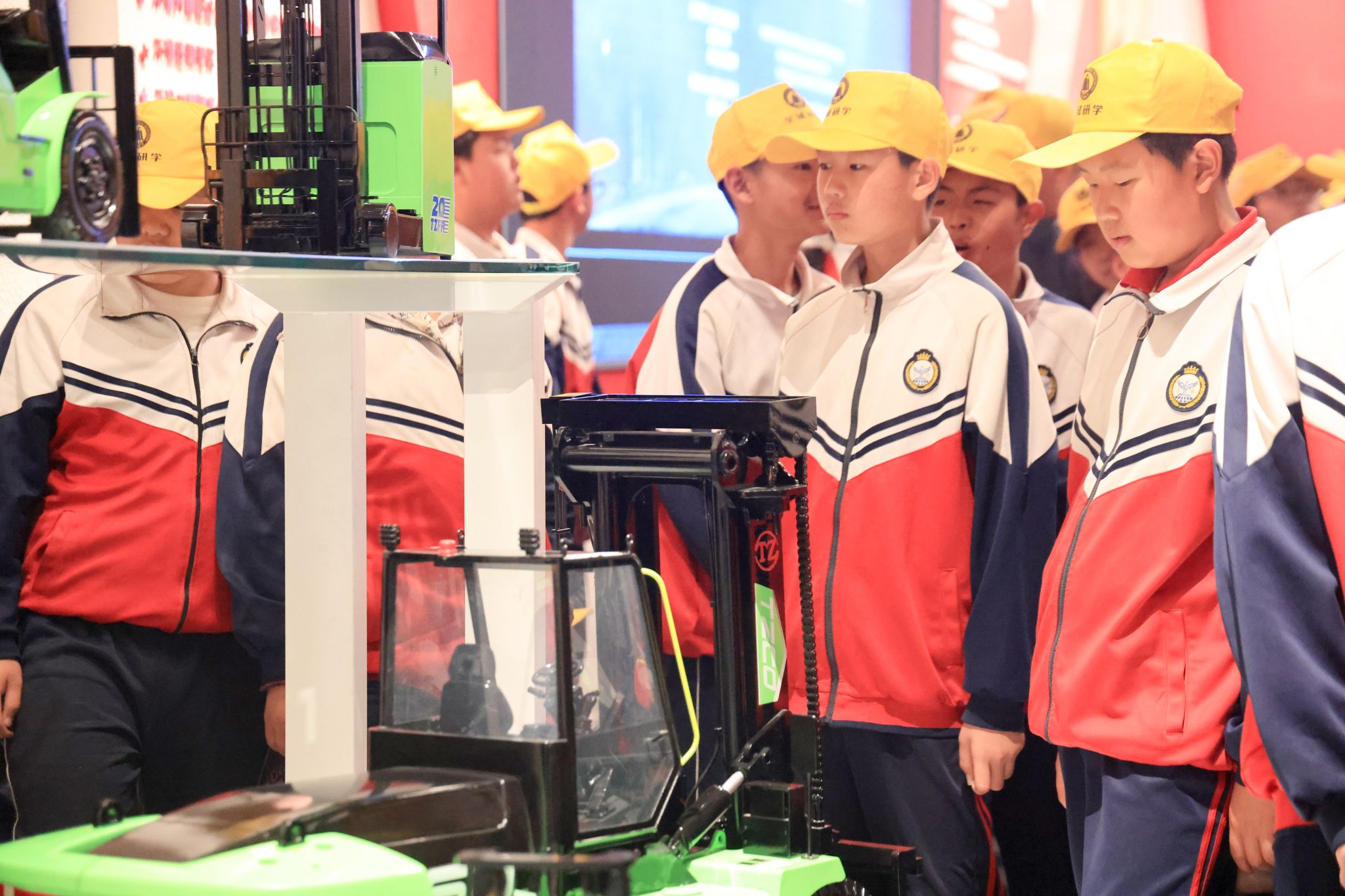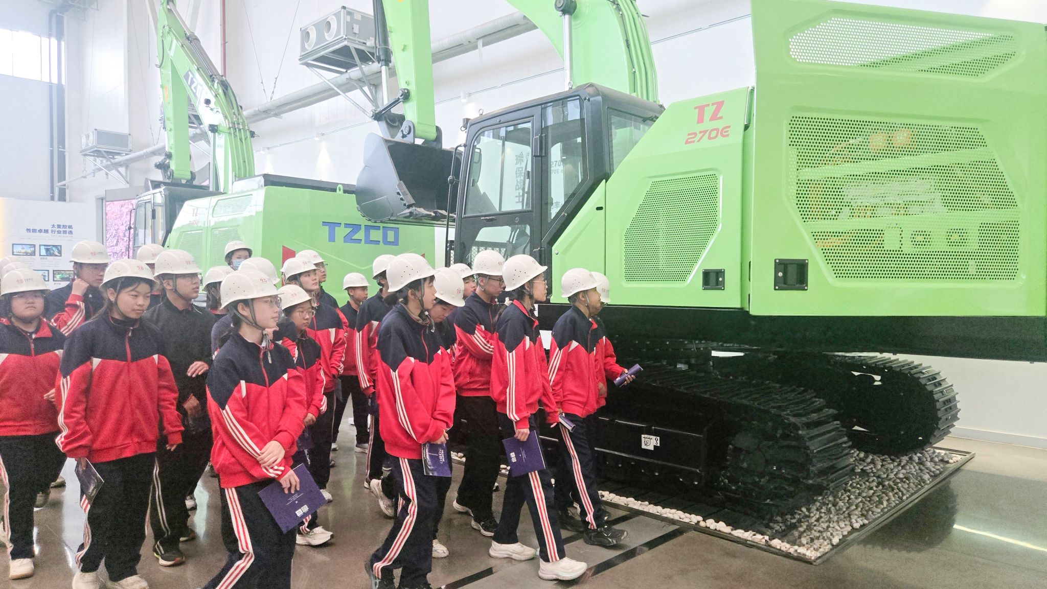 工程机械公司,自动化生产线高速运转,机械臂精准挥舞,无人搬运车穿梭其间,科技感扑面而来。少年们穿梭在钢铁巨臂之间,眼中燃烧着对科技的热情。“原来工厂可以这么酷!”“我以后也想造会思考的机器!”这份好奇与向往,正是大国重器生生不息的未来。