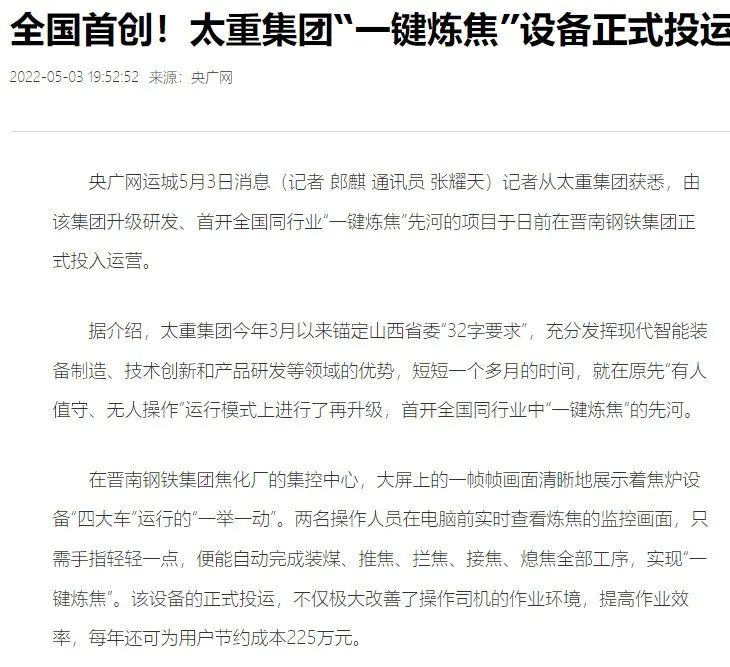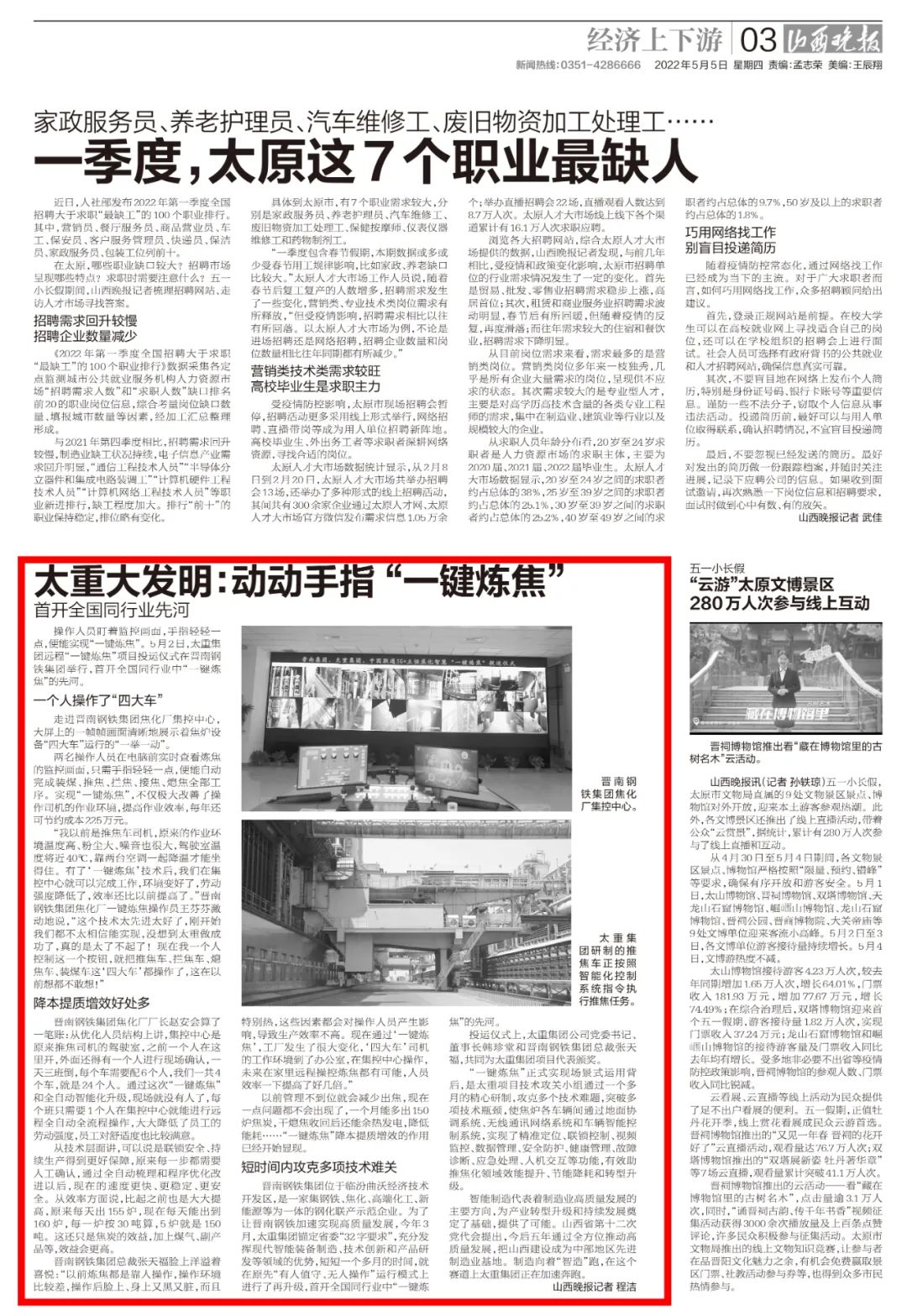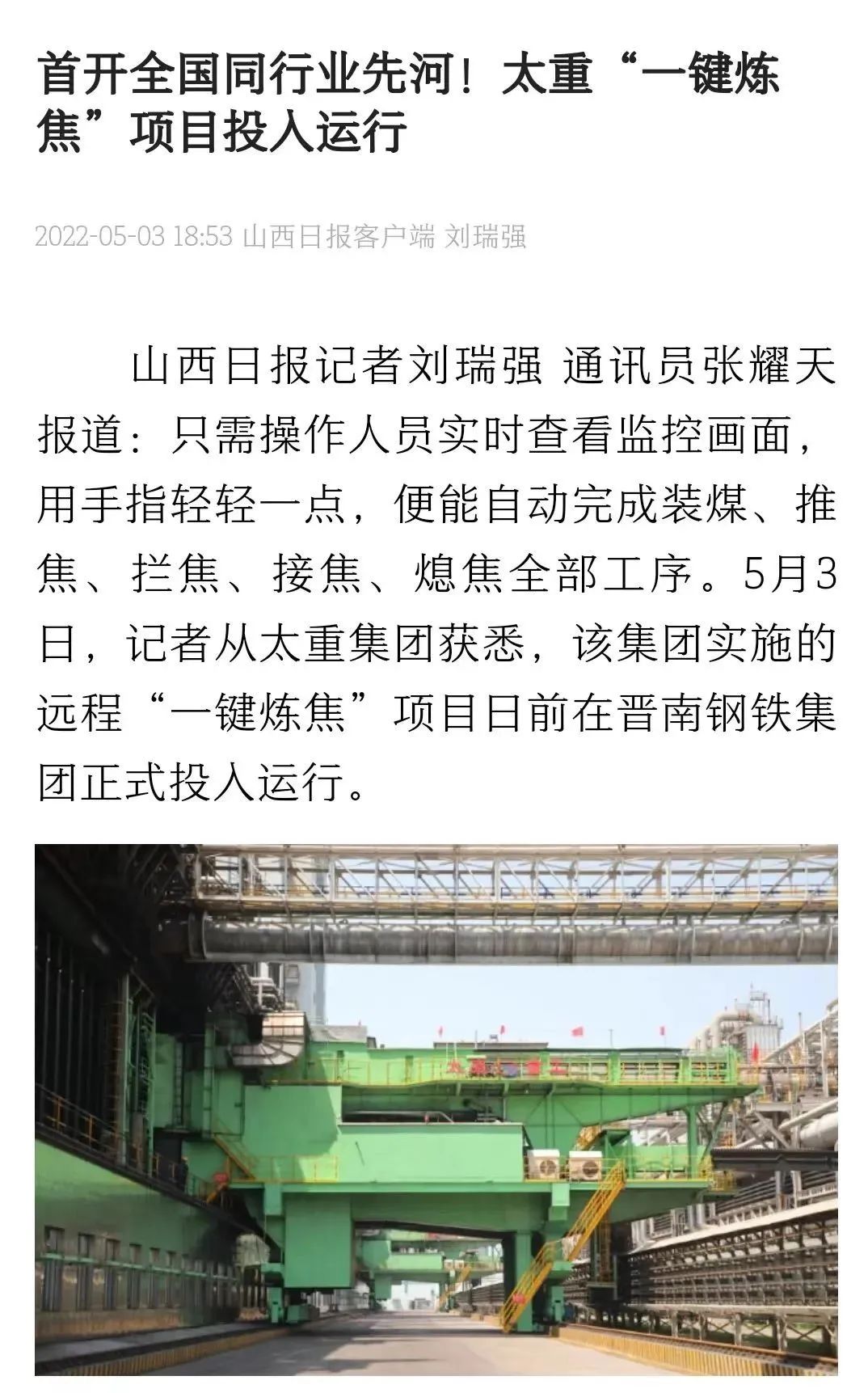 “一键炼焦”项目成果,实现智能绿色工厂转型再升级。山西日报、山西晚报、太原日报分别以《首开全国同行业先河!永利赌场