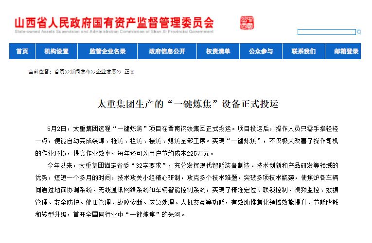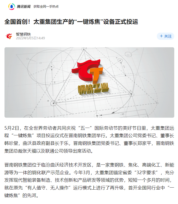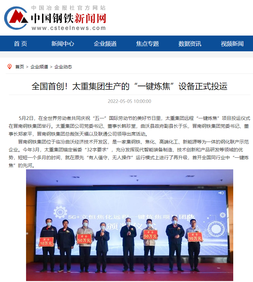 “一键炼焦”项目引起各大媒体广泛关注。央广网、中国经济网、中国钢铁新闻网、网易、搜狐、腾讯、山西日报、山西国资、山西晚报、太原日报等各大门户网站以及山西新闻联播等多家媒体对此进行宣传报道。