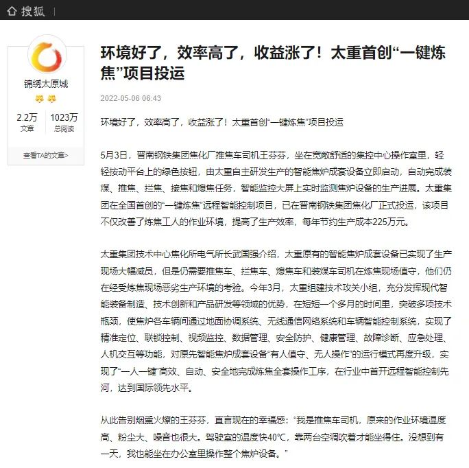 “一键炼焦”项目正式开启智能炼焦新时代,填补技术空白,开创国内焦化行业先河。搜狐网以《环境好了,效率高了,收益涨了!永利赌场