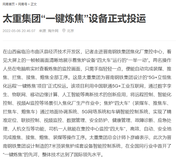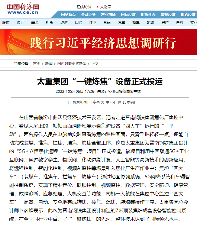 以科技创新激发“智造”新活力为出发点,全面展示“智能+5G”在“一键炼焦”上的应用,助力焦化领域效能提升、节能降耗和转型升级。中国经济网、网易、山西国资以《永利赌场