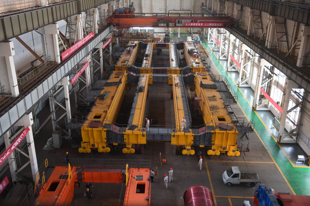 起重机分公司车间,550吨铸造起重机正在进行装配作业。