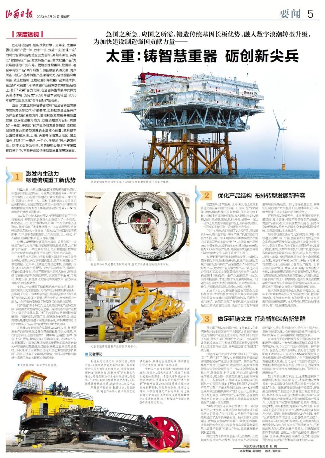 以打造“产品一流、效率一流、效益一流、治理一流”的现代智能装备制造企业为目标,高起点谋划,实施以“做强传统产品、做优转型产品、做大批量产品”为发展路径的产业布局。提档加速起重机、挖掘机、冶金等传统产品“两个转型”,创新赋能轨道交通、海洋装备、液压产品等转型产品激活动力,培优塑强风电装备、液压挖掘机、工程起重机等批量产品聚链成群,在当好“双链主”、引领我省产业链集群发展的新征程上,张开“双翼”奋力飞翔,在全省转型发展中发挥龙头带动作用,为完成“2030年基本实现转型、2035年基本实现现代化”奋斗目标作出贡献。