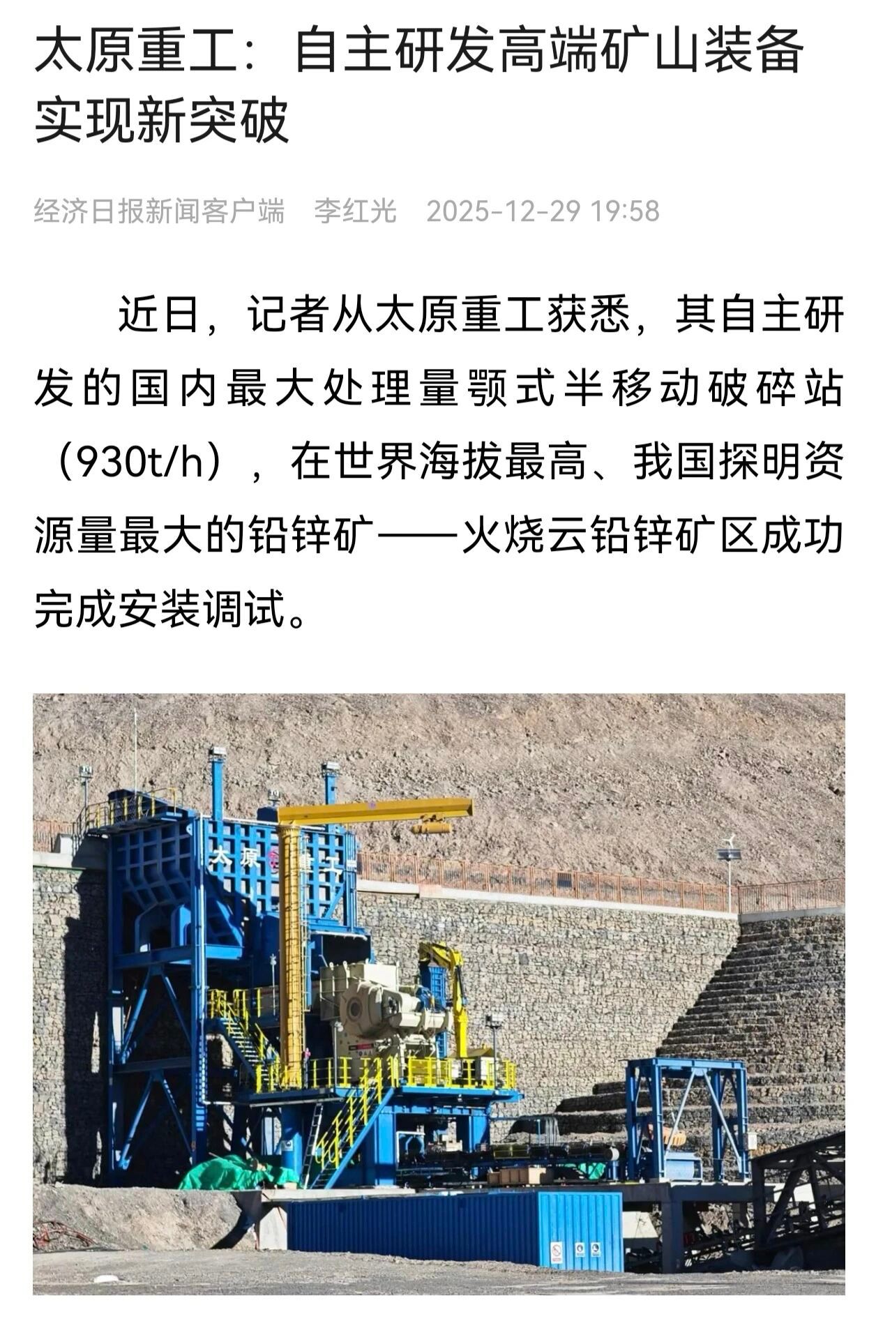 近日,记者从太原重工获悉,其自主研发的国内最大处理量颚式半移动破碎站(930t/h),在世界海拔最高、我国探明资源量最大的铅锌矿——火烧云铅锌矿区成功完成安装调试。火烧云铅锌矿区位于新疆西南端,平均海拔5600米,最低气温低至零下42摄氏度,空气含氧量不足平原地区的60%。“高”与“寒”是设备平稳高效运行的最大挑战。工作人员形象地比喻,设备在高原上面临的电气性能衰减,就如同“戴着口罩跑马拉松”。面对这样的极端环境,太原重工技术团队展开针对性攻关。穿上“智能保温衣”,为设备的抑尘系统创新设计了伴热带与保温层双重防护,确保在极寒温度中可随时正常启动;搭载“秒级排空”,利用高压气吹扫系统,在设备停机后的瞬间,彻底排空管道内残余水分,避免结冰风险;创新应用“高原专用心脏”,对核心电机和电控元件进行个性化设计与优化,解决高原缺氧导致的“动力衰减”难题。解决了“高”与“寒”之后,如何实现用得“久”是团队面临的又一课题。大型破碎站在给料、破碎、卸料过程中产生的剧烈冲击与振动,是影响设备寿命和稳定性的关键问题。太原重工团队采用“独立支撑+软连接密封”设计,让高原设备也能拥有“耐久度”。各核心部件拥有自己独立的底座,彼此之间用柔性材料进行连接密封,就像为设备钢铁骨架装上高性能“缓冲关节”,既能牢牢固定,又能吸收化解冲击,使机械共振与磨损大幅降低。与此同时,该破碎站还搭载了先进的智能控制系统,能够实时感知物料状态。根据来料多少、矿石硬度等参数,自动调节破碎节奏,实现高效节能运行,整套系统正朝着“无人值守”的智能运行模式稳步迈进,整体效率实现提升约5%。从攻克高寒缺氧环境下设备稳定运行的关键技术,到实现智能高效的环保作业,太原重工自主研发的破碎站在世界最高矿山的成功应用,彰显了其在高端矿山装备领域雄厚的自主创新实力,为高原矿产资源的开发与绿色矿山建设注入澎湃动力。
