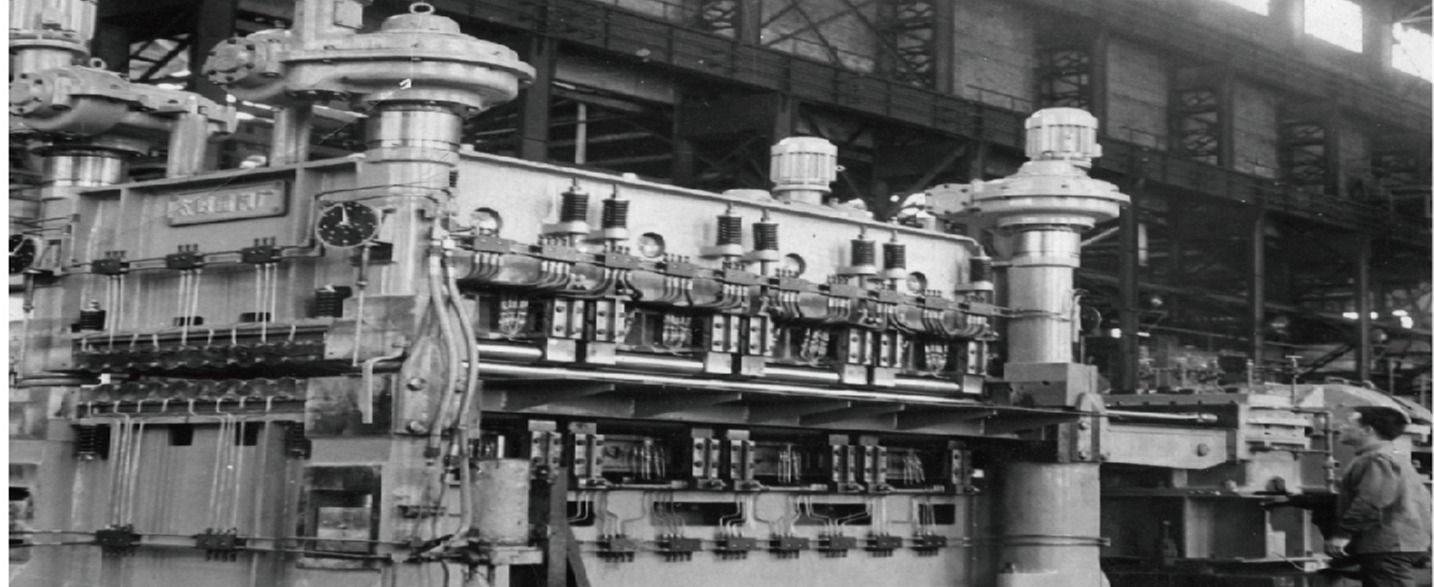 板材矫正机是永利赌场 的拳头产品之一,多次荣获国家和省部级奖励。辊数从五辊到二十三辊,矫平厚度从0.5至100毫米,已发展成为系列产品。图为1965年试制成功的17辊矫正机。